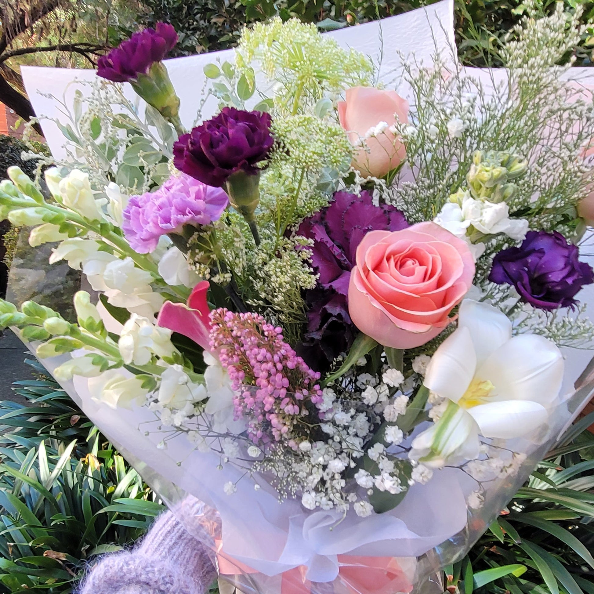 A stunning bouquet showcasing the timeless beauty of purple. Delicate blooms in varying shades create an enchanting display, radiating elegance and charm. Perfect for expressing love, admiration or adding a touch of enchantment to any occasion.